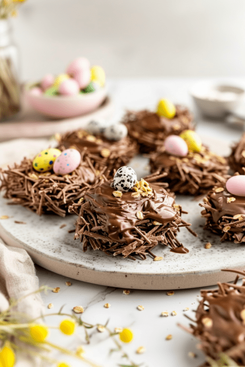 While the chocolate is still wet, place 2-3 mini chocolate eggs in the center of each nest. Sprinkle with granola or crushed nuts for added texture, if desired.