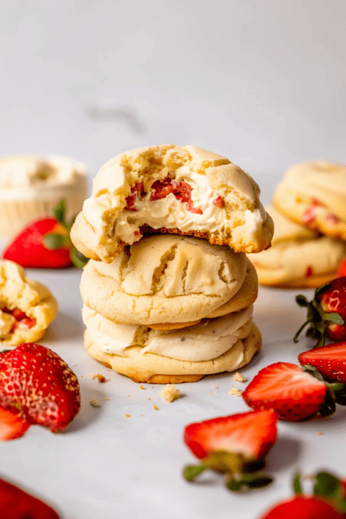 These Strawberry Cheesecake Stuffed Cookies combine the best of two desserts into one indulgent treat. They feature a soft, buttery cookie exterior with a luscious cream cheese and fresh strawberry filling hidden inside. The result is a rich, creamy, and slightly tangy cheesecake center wrapped in a melt-in-your-mouth vanilla cookie.