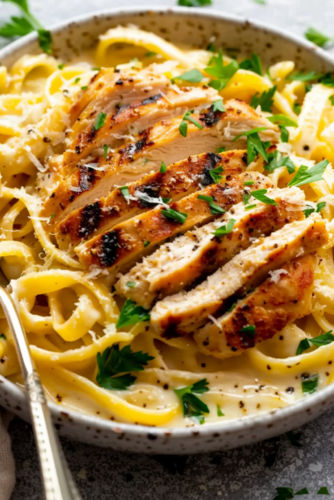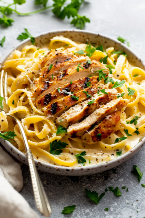 Add the cooked fettuccine to the sauce, tossing to coat evenly. Allow the pasta to absorb the sauce for 1-2 minutes. Plate the pasta, then top with sliced chicken. Garnish with chopped parsley and extra Parmesan. Serve immediately while warm.