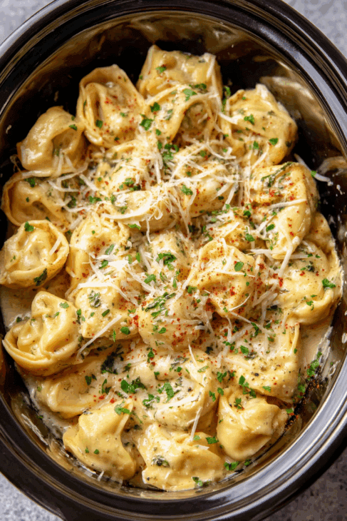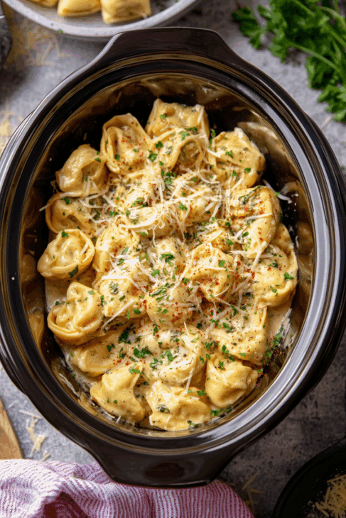 This simple slow-cooker meal is perfect for busy weeknights or lazy weekends. The cheese tortellini soak up a flavorful, creamy sauce loaded with garlic, herbs, and parmesan for a dinner that feels indulgent with minimal effort.