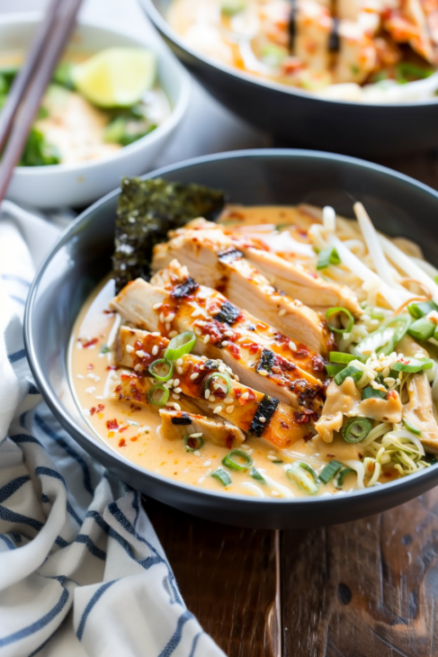 Divide the noodles among serving bowls. Pour the hot creamy garlic broth over the noodles. Arrange the sliced grilled chicken on top, followed by soft-boiled egg halves, nori strips, bean sprouts, and green onions. Sprinkle with toasted sesame seeds and an extra drizzle of chili oil for more spice.