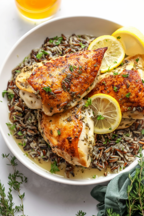 Serve over a bed of wild rice, lemon herb rice, or creamy mashed potatoes to soak up the pan juices
