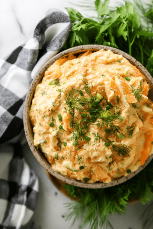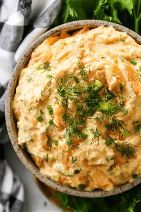 Add in the smoked salmon, green onion, dill, and chives. Gently fold the ingredients together so you don’t break down the salmon pieces too much. Letting the dip chill for at least 30 minutes helps the flavors meld beautifully.