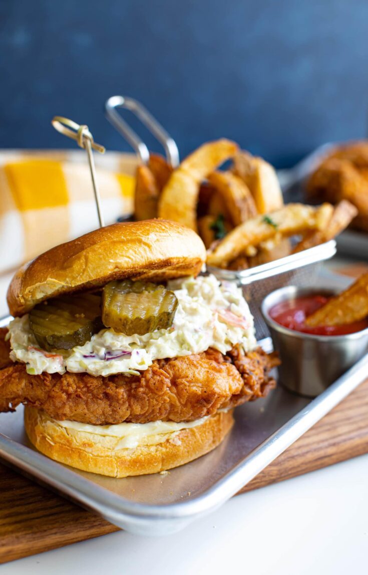 Sink your teeth into the ultimate comfort sandwich—crispy buttermilk fried chicken piled high with crunchy slaw and nestled in a soft bun. Each bite is juicy, tangy, and soul-satisfying. Whether for dinner or game day, this sandwich delivers bold Southern flavor that hits every single note.