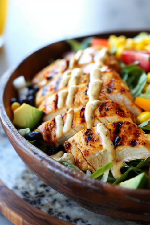 Add the sliced grilled chicken on top of the salad and drizzle generously with the chipotle dressing. Serve immediately and enjoy!