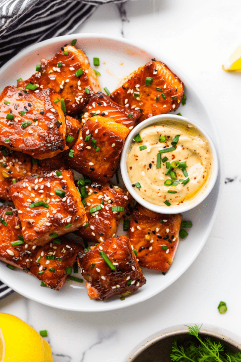 Transfer the cooked salmon bites to a serving plate. Sprinkle with sesame seeds and chopped green onions. Serve immediately with the spicy mayo dipping sauce and lemon wedges on the side.