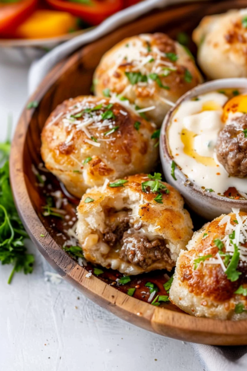 Let the cheeseburger bombs cool slightly before serving. They are best enjoyed warm with dipping sauces like garlic aioli, ranch, or marinara sauce.